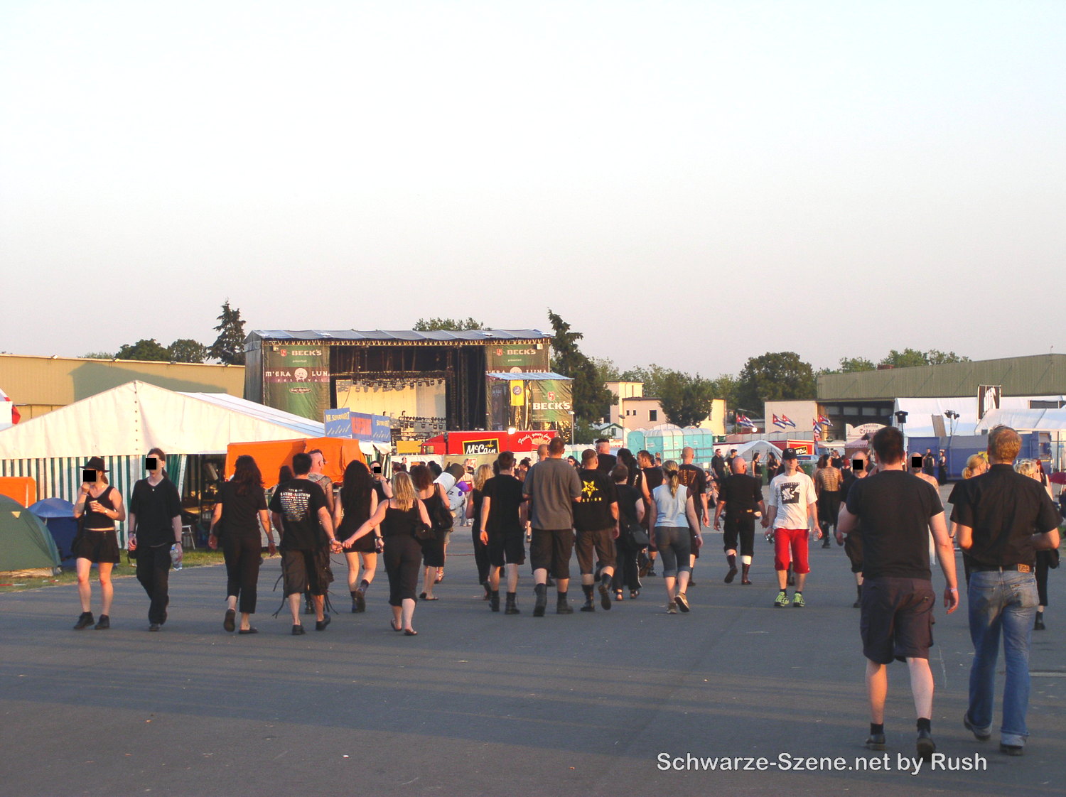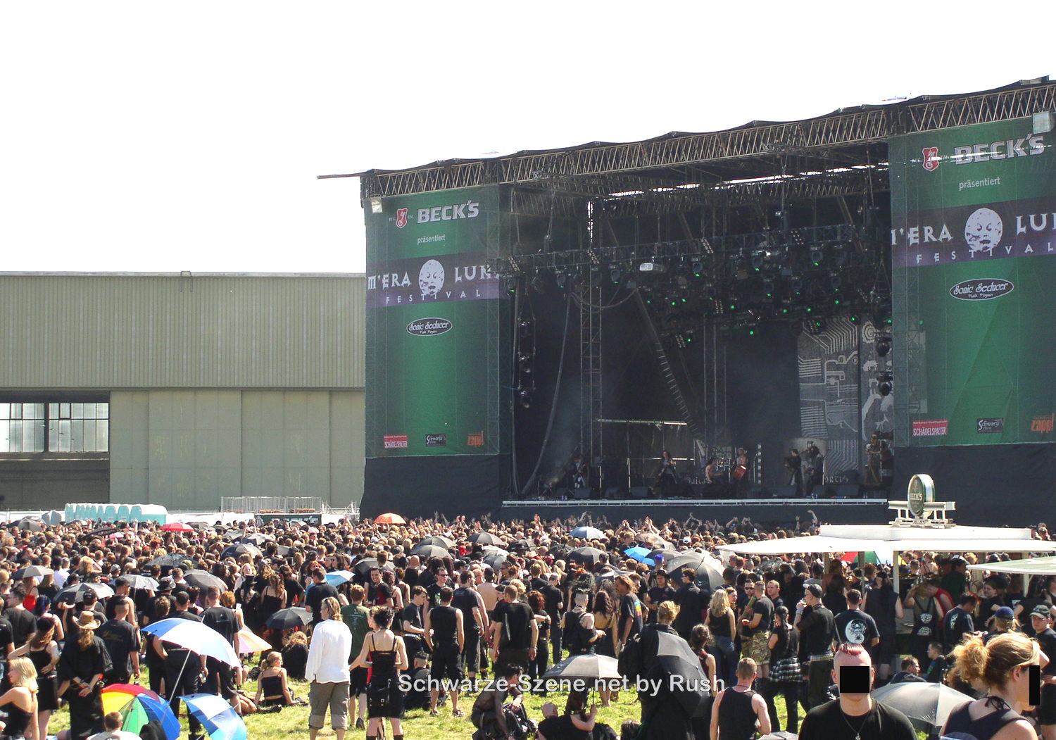 Blick auf die Büh­ne – also die Haupt­büh­ne, dazu gab es noch in direk­ter Nähe den Han­gar, also ohne den wei­ten Lauf­weg wie heu­te zur zwei­ten Büh­ne. Hier spie­len gera­de Sal­ta­tio Mor­tis.