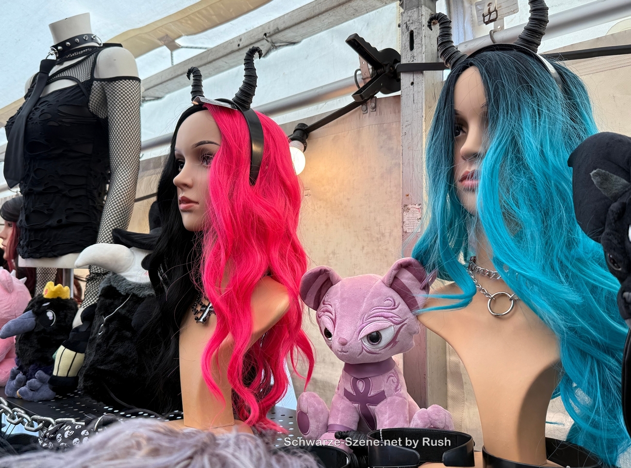 Shopping-Runde hinter der Club-Stage, aber Corri-May und ich merken immer wieder, daß uns die vollen, überhitzten Stände nerven. Also eher von außen mal drüberschauen, weitergehen. (Und manchmal auch staunen, was jetzt Utensilien der ‚Schwarzen Szene‘ sind.) Die Jacke, die ich kaufen wollte, habe ich nicht bekommen. Na ja, andermal. Beim Piercing-Stand von Wildcat war dauerhaft guter Andrang – da werden wir im Oktober mal lokal schauen.