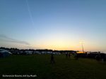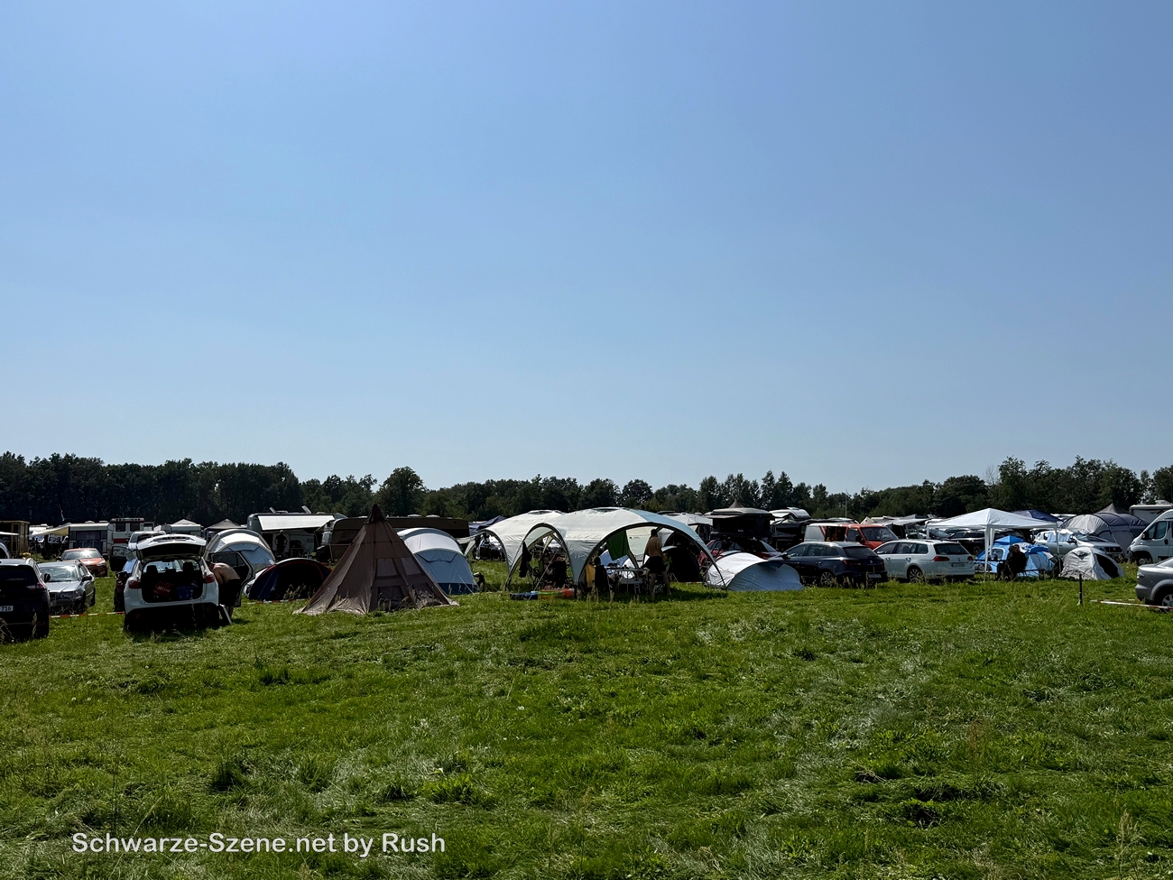 Die Beifahrer sprangen dann am Bändchenstand aus den Autos, holten Bändchen, Mülltüten, SN-Gummibären, Infos – und ab ging es auf die große Wiese, die mit Fahrwegen (und Holzkreuzen) abgesteckt war. Wir konnten in der „Straße“ direkt zu den Sanitäranlagen parken – gerade 200m von der Bühne weg. Neben uns Bochumer, kurzes Gespräch, Mithilfe beim Rangieren eines Wohnwagens. Markise rausdrehen, Tisch und Stühle auspacken, Gas aufdrehen – das Übliche.