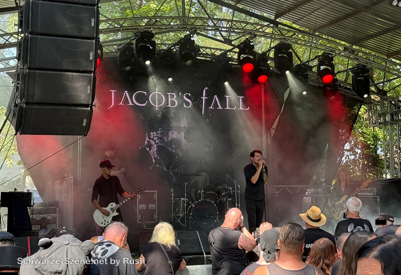 Die erste Band am Nachmittag bei gut 35°C, Necro Fear, haben wir vom Camp aus gehört. Ich würde sagen: eingängiger Elektro. Erst zu Jacøb’s Fall waren wir vor der Bühne. Die spielten Dark Rock, erinnerten mich z.T. an Aeon Sable. Ein schönes Erlebnis.