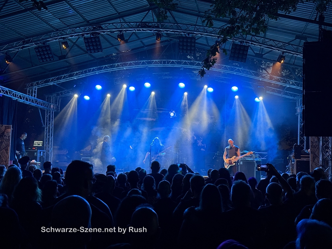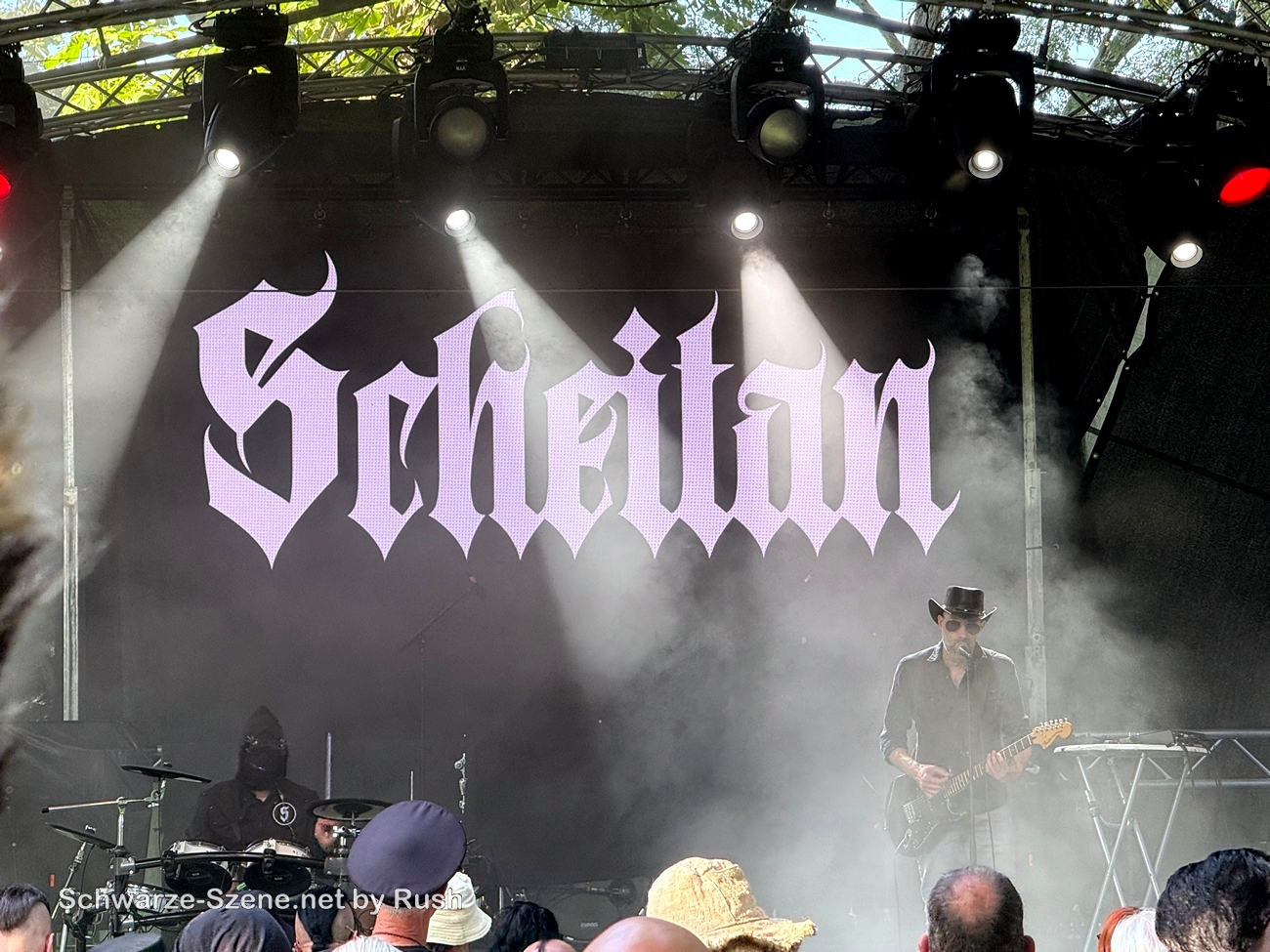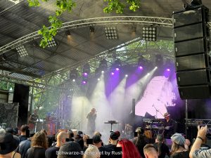 Hin zum Merch-Stand – lange Schlange. Angenehme Gespräche – überhaupt: man spricht so viel mehr mit anderen Menschen als beim Mera Luna. Maybe it’s just me. Wieder einmal Festival-Erinnerungen und -empfehlungen ausgetauscht. So hörten wir Scheitan aus der Nähe, ohne den Auftritt zu sehen. Das war, ich würde sagen, melodiöser (Death-)Rock. Ergattert haben wir zwei 2025er SN-Shirts und einen edlen Metall-Pin.