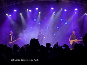 Dann waren wir schon beim Headliner des Donnertags: die The-Cure-Coverband „Four Imaginary Boys„. Leider klappt der Bühnenumbau und das Setup der Technik nicht so gut, so daß die Band Zeit verlor: „Boys don’t cry“ konnte nicht als letzter Song gespielt werden. Man stieg ein mit der aktuellen Single „Alone“, um dann für gut eine halbe Stunde langsame, m.E. unbekanntere, modernere Songs zu spielen. Das fand ich schräg, weil The Cure soviele (alte) Hits haben, die man eine ganze Stunde lang hintereinander hätte hängen können. So ging das Publikum auch erst richtig mit, als diese Lieder kamen: In-Between Days, Lovesong usw. Wegen der Technik-Probleme endete man mit „A Forest“.